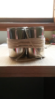 Fizemos um telefone com 2 latinhas de leite condensado(uma delas é a da direita na foto acima), e 10 metros de barbante; um com esse copo do Starbucks e uma latinha de milho(não está na foto) e 10 metros de três fios de crochê; o último fizemos com o 2 copinhos de plástico e 10 metros de barbante.